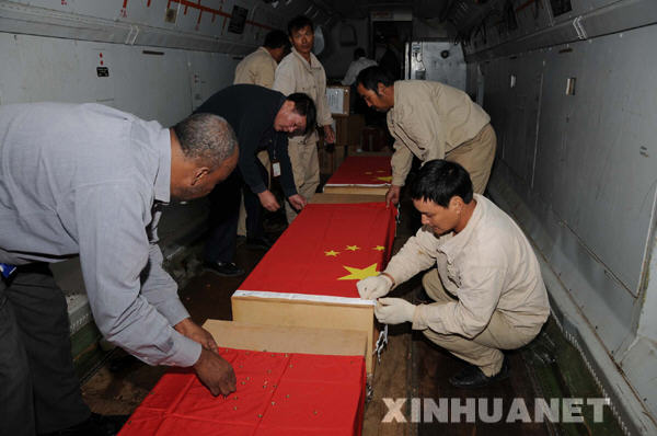 10月28日晚,3名遇害中國工人的棺材被抬下飛機之前,工作人員給棺材蓋上中國國旗。當晚,在蘇丹西南部地區(qū)被綁匪殘忍殺害的3名中國工人的遺體被專機運到喀土穆。新華社記者邵杰攝
