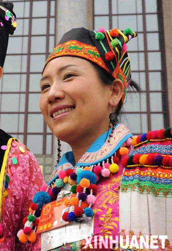 這是來自云南的楊艷代表(德昂族)在北京人民大會堂前。 新華社記者楊宗友攝