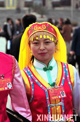 這是來(lái)自甘肅的全國(guó)人大代表馬曉琴(保安族)在北京人民大會(huì)堂前。 新華社記者劉泉龍攝