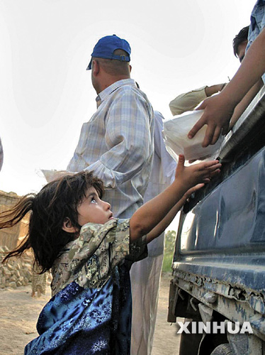 這是2006年10月11日,一名伊拉克兒童在卡爾巴拉從志愿者手中接過食物。