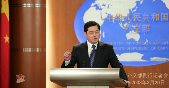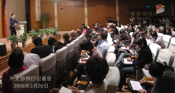2008年3月20日下午,外交部發(fā)言人秦剛舉行例行記者會,就近期拉薩發(fā)生的打砸搶燒嚴重暴力犯罪事件等問題答問。
