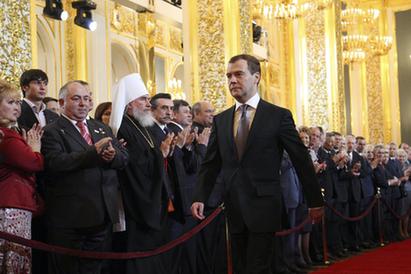 5日7日,梅德韋杰夫步入克里姆林宮的安德烈耶夫廳,參加就職儀式
