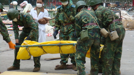 官兵們將挖掘出來的學(xué)生遺體抬走