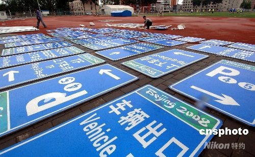 在通往各奧運(yùn)有關(guān)場(chǎng)地的途中,寫(xiě)有“2008北京奧運(yùn)”的路牌十分醒目,這些路牌不僅明確標(biāo)出場(chǎng)館、奧運(yùn)村、新聞中心等主要場(chǎng)地的所在和路程,還有加油站、物流中心等相關(guān)配套地點(diǎn)的走向。
