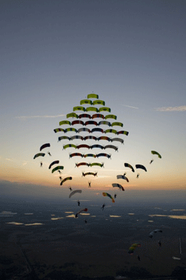 在談到組織這次活動(dòng)的初衷時(shí),這位43歲的跳傘高手說道:“德國(guó)人在1996年創(chuàng)造53人的紀(jì)錄時(shí)曾宣稱,那個(gè)隊(duì)型已經(jīng)達(dá)到極限,不可能再大了,那時(shí)我就想進(jìn)行100人的表演……對(duì)我來說這是一個(gè)挑戰(zhàn),我們于是決定看看到底能進(jìn)行到哪一步……2003年我們組織了70人的表演,2005年又創(chuàng)造了85人的紀(jì)錄,直到那時(shí)我們才意識(shí)到100人的表演是可行的?!?/span>