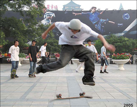 一張拍的是兩個(gè)北京的年輕人,踩著滑板的他們穿著和舉止都如同發(fā)達(dá)國(guó)家的同齡人。另一張照片上在河中竹排上嬉戲的是一幫放假的鄉(xiāng)下孩子,估計(jì)他們還沒有滑板。