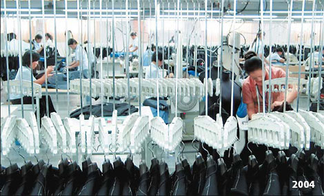 同理,如果沒有這些女裁縫以及其他城鎮(zhèn)與他們一樣的裁縫們,中國可能就不會有這么多像這張彩色照片上一樣的現(xiàn)代化成衣制造廠。這張彩照拍于2004年的沿海省份——浙江,那個年代正是中國紡織行業(yè)的黃金時期。