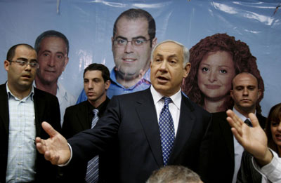 2月9日,在特拉維夫附近地區(qū),利庫德集團(tuán)主席內(nèi)坦尼亞胡與支持者在一起。