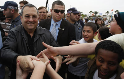 2月9日,以色列國防部長、工黨領(lǐng)袖巴拉克在一個(gè)植樹儀式開始前