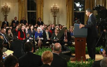 奧巴馬的首場新聞發(fā)布會當晚在白宮東廳舉行,持續(xù)近一個小時,記者們一共提出13個問題。發(fā)布會正值美國電視晚間黃金檔,預計全國有數(shù)百萬人收看了現(xiàn)場直播。