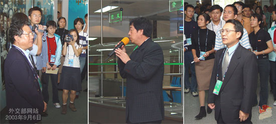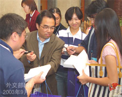 中國日報網(wǎng)環(huán)球在線消息:2003年9月6日上午,外交部以“走進外交部”為主題,舉辦了首次“公眾開放日”活動。有來自北京大學、清華大學、中國人民大學和北京理工大學四所高校學生、外交部網(wǎng)站“中國外交論壇”部分資深熱心讀者及“外交部網(wǎng)站形象設(shè)計大賽”獲獎?wù)撸?img align="right" height="200" hspace="10" id="1225058" md5="" name="normal" src="../../images/attachement/jpg/site1/20090305/0013729e42ea0b19be3c03.jpg" style="WIDTH: 300px; HEIGHT: 200px" vspace="10" width="300"/>35名關(guān)心中國外交事業(yè)的公眾參加了本次活動。外交部副部長戴秉國、部長助理沈國放參加活動并與公眾進行親切交談。