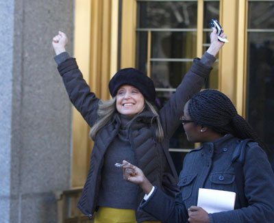 一名麥道夫金融詐騙案的受害者走出法庭后舉起雙臂慶祝。