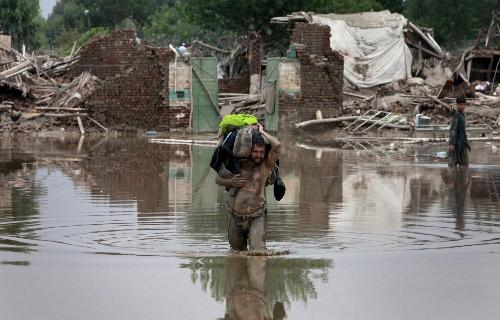 8月2日,巴基斯坦西北部開伯爾-普什圖省,一名男子帶著財物逃離家園