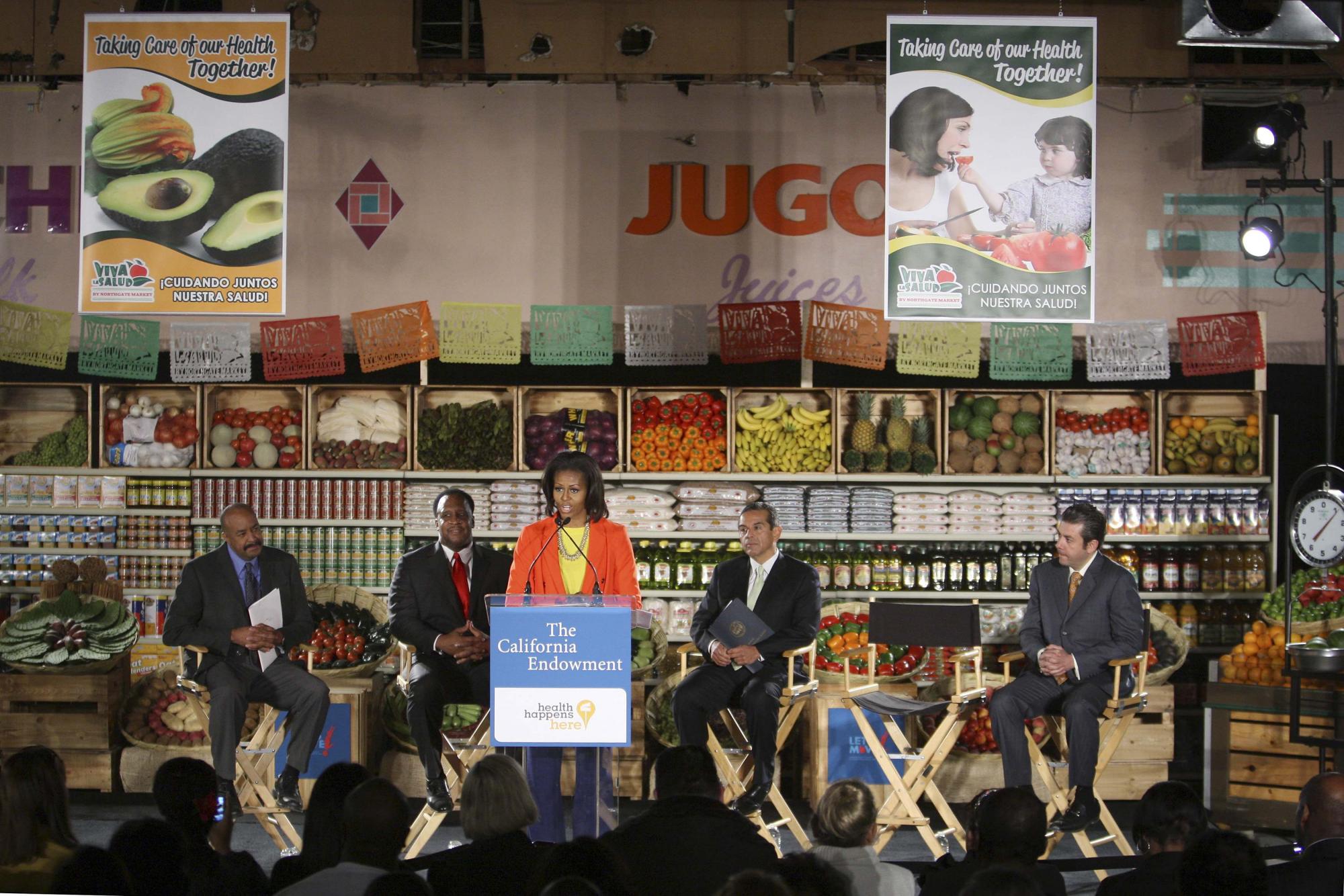 米歇爾在加利福尼亞州做演講,鼓勵(lì)孩子們多吃水果和蔬菜等健康食品。