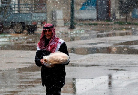 一名敘利亞老人懷抱面包走在庫(kù)塞爾市街道上。