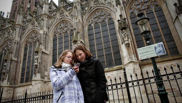 兩名女孩正在荷蘭斯海托亨博斯圣約翰大教堂外撥打天使熱線