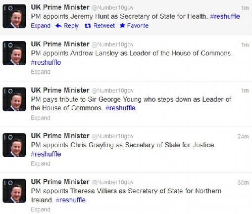 從當天上午10點起,卡梅倫在推特上至少發(fā)布了14條信息,對200萬粉絲公布他新任命的內(nèi)閣成員。這些信息加起來不超過140個字符。