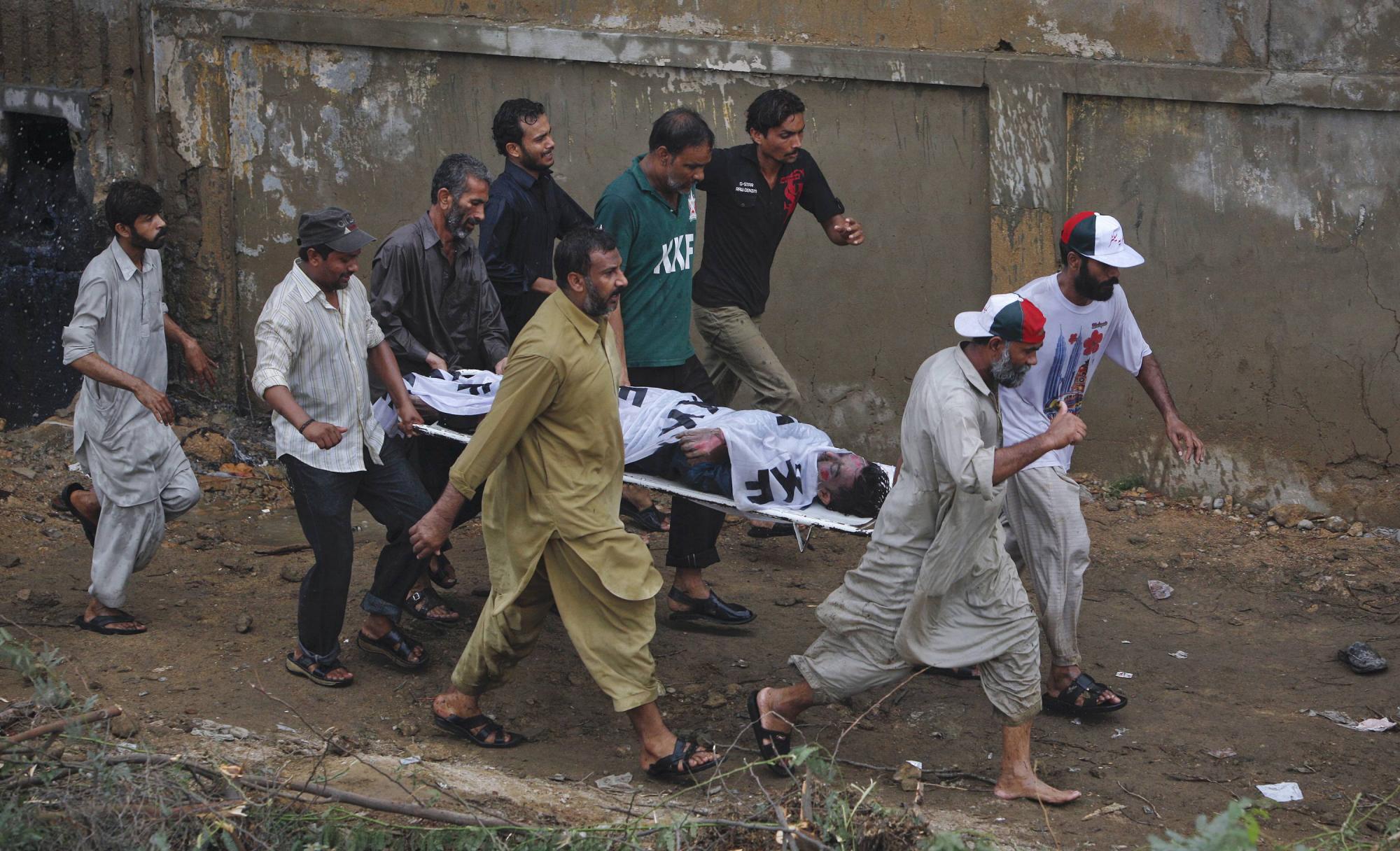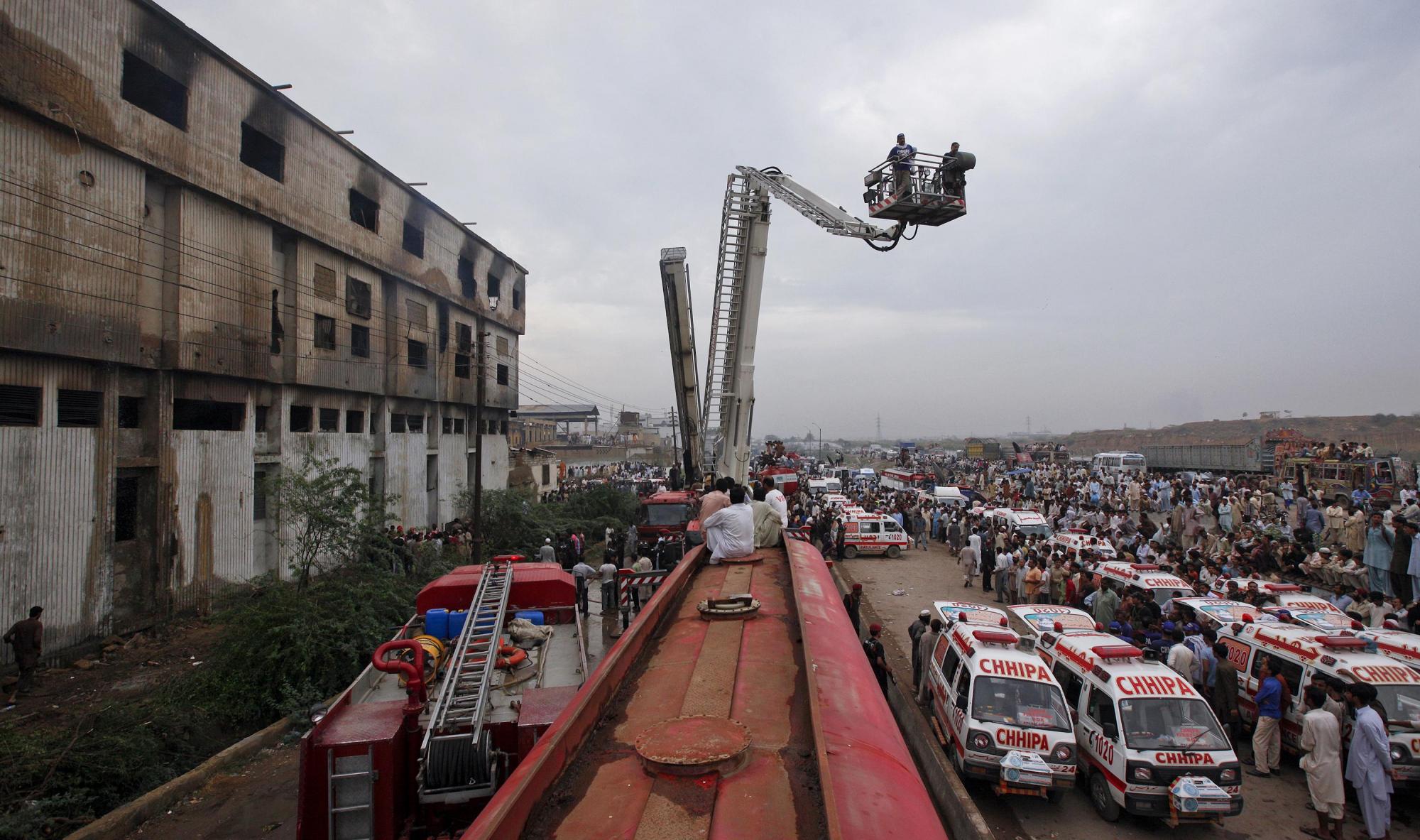 9月12日,卡拉奇失火的服裝廠外救護(hù)車云集。
