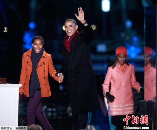 資料圖:當?shù)貢r間2012年12月6日,美國華盛頓,美國總統(tǒng)奧巴馬、第一夫人米歇爾以及他們的兩個女兒一起出席國家圣誕樹亮燈儀式。