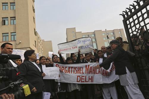 印度律師在新德里一處法院外高呼口號,游行示威。