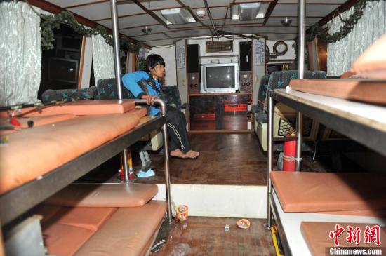 全家福號”保釣漁船于24日凌晨1時45分由新北市深澳港出發(fā)前往釣魚島海域進行保釣活動。圖為一船員坐在船艙里驚魂未定。中新社發(fā)王東明 攝