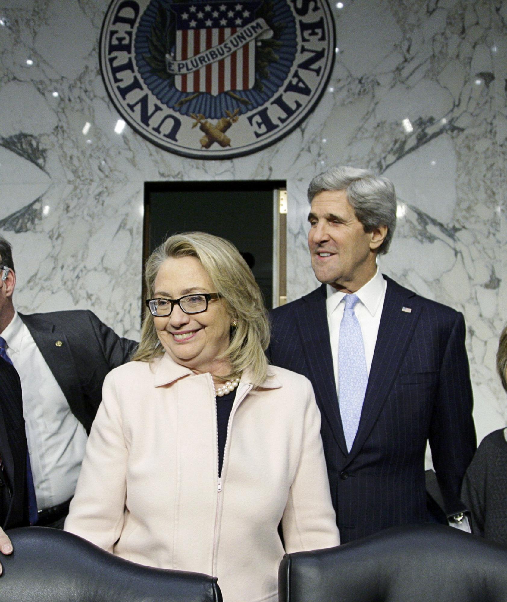 1月24日,希拉里和克里(右)出席在國會舉行的國務(wù)卿提名人聽證會。
