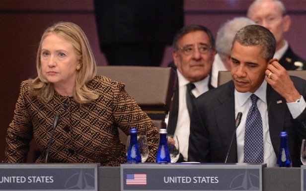 美國(guó)前國(guó)務(wù)卿希拉里(左)等官員曾提議向敘利亞反對(duì)派提供武器援助,但遭到奧巴馬總統(tǒng)的拒絕。