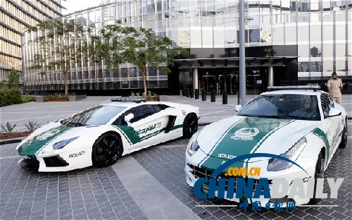 早在本月11日,迪拜警方就展出了蘭博基尼(左)豪華警車,現(xiàn)在他們又添置了一輛法拉利。