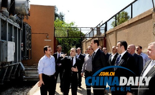 在敘利亞首都大馬士革遭受炸彈襲擊后,敘利亞總統(tǒng)阿薩德5月1日來到伍麥葉電站看望工作人員。