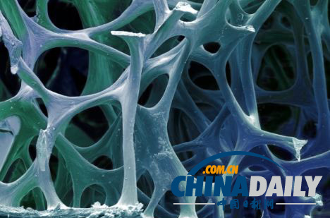研究人員將皮膚細(xì)胞重新編排成能夠形成早期階段骨細(xì)胞的干細(xì)胞,圖為骨細(xì)胞內(nèi)部的海綿狀結(jié)構(gòu)。