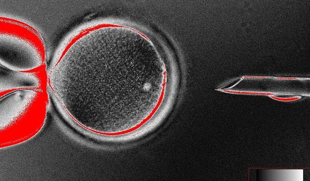 在移除細(xì)胞核之前,一個(gè)未受精的卵細(xì)胞在移液管里。