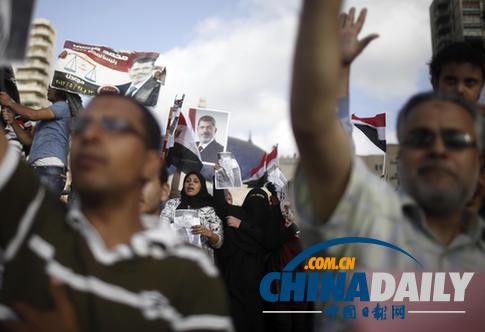 埃及總統(tǒng)穆爾西的支持者在抗議活動中喊著口號