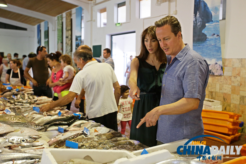 當(dāng)?shù)貢r(shí)間2013年7月26日,葡萄牙西南沿海,英國(guó)首相卡梅倫和妻子薩曼莎一起購(gòu)買(mǎi)魷魚(yú)。