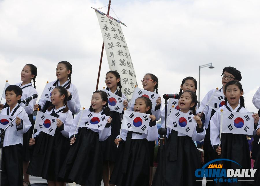 李容女舉行紀念活動,抗議日本。圖為孩子們身著韓服,為李用女唱安魂曲。