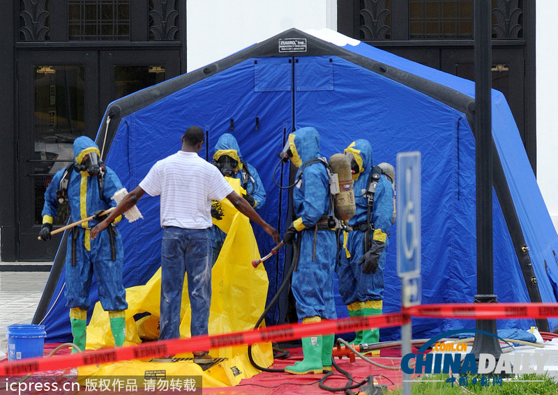 當(dāng)?shù)貢r(shí)間2013年8月14日,美國阿拉巴馬州蒙哥馬利,郵政檢查員身穿防護(hù)服檢查一名員工。美國阿拉巴馬州總檢察長辦公室收到一封內(nèi)含可疑粉末的信件。(圖片來源:東方IC)