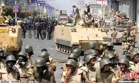 埃及安全部隊在當?shù)貢r間8月14日對兩處抗議者營地進行“清場”行動,終止前總統(tǒng)穆爾西支持者的靜坐示威。清場行動開始后雙方爆發(fā)激烈沖突造成嚴重傷亡,據(jù)法新社報道,死亡人數(shù)升至278人,其中包括43名警察。稍早前,埃及衛(wèi)生部的消息則表示,沖突也造成1403人受傷。埃及總統(tǒng)府于當日宣布全國進入為期一個月的緊急狀態(tài),在每日19時至次日6時實行宵禁。圖為防爆警察和軍方人員出動裝甲車。