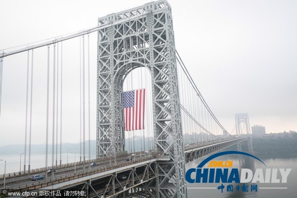 當(dāng)?shù)貢r間2013年9月2日,美國恩格爾伍德,美國勞動節(jié)慶祝期間,喬治華盛頓大橋上懸掛著世界最大的美國國旗。