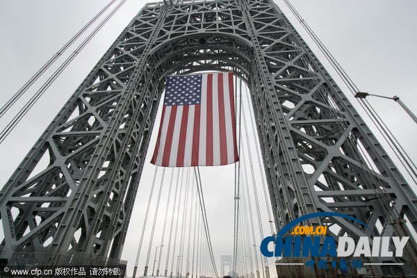 當(dāng)?shù)貢r間2013年9月2日,美國恩格爾伍德,美國勞動節(jié)慶祝期間,喬治華盛頓大橋上懸掛著世界最大的美國國旗。