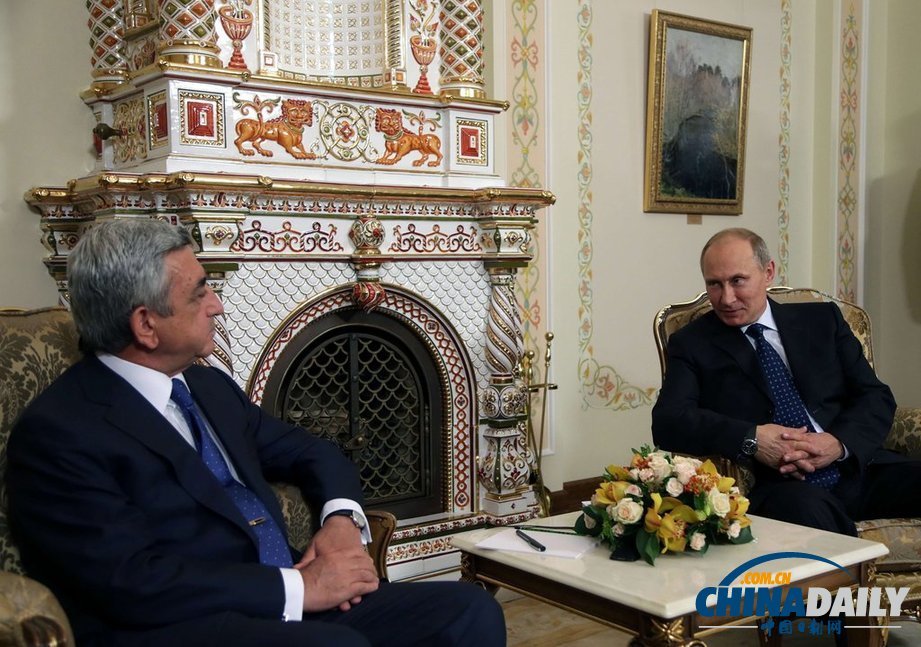 當(dāng)?shù)貢r(shí)間2013年9月3日,俄羅斯莫斯科,俄羅斯總統(tǒng)普京與到訪亞美尼亞總統(tǒng)薩奇席恩(Serzh Sarkisian)舉行會(huì)晤。此前,普京曾否認(rèn)敘利亞政府軍使用化學(xué)武器,稱(chēng)這一說(shuō)法“完全是胡說(shuō)八道”,并指出美國(guó)的全球政策很失敗。(圖片來(lái)源:CFP)