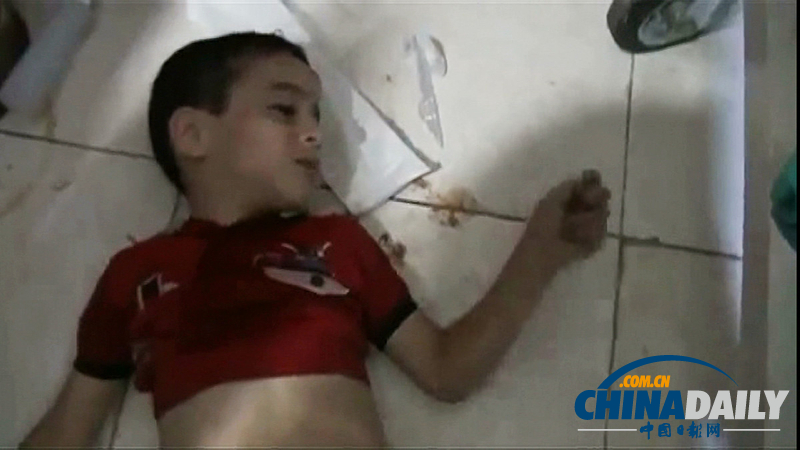 視頻截圖:當(dāng)?shù)貢r間2013年9月5日公布,美國政府向參議員播放的敘利亞化學(xué)武器襲擊視頻曝光,視頻中的受害者是8月21日在敘利亞大馬士革郊區(qū)Ain Tarma遭到襲擊的民眾,這些受害者均躺在地上。(圖片來源:東方IC)