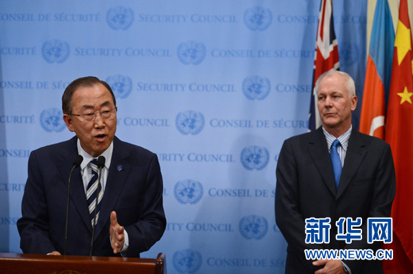 9月16日,聯(lián)合國(guó)秘書長(zhǎng)潘基文(左)和聯(lián)合國(guó)調(diào)查敘利亞化學(xué)武器問(wèn)題真相小組負(fù)責(zé)人、瑞典科學(xué)家塞爾斯特倫在紐約聯(lián)合國(guó)總部出席新聞發(fā)布會(huì)。聯(lián)合國(guó)16日公布了聯(lián)合國(guó)調(diào)查敘利亞化學(xué)武器問(wèn)題真相小組關(guān)于敘利亞境內(nèi)最新一起化武襲擊傳聞的調(diào)查報(bào)告。報(bào)告證實(shí),8月21日在大馬士革姑塔東區(qū)存在使用化學(xué)武器的行為。(新華社記者牛曉雷攝)