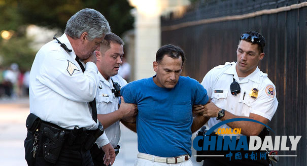 當(dāng)天傍晚6點(diǎn)半左右,這名身穿藍(lán)色短袖T恤和淺色短褲的白人男子在白宮北草坪外點(diǎn)燃一支爆竹扔向白宮。值勤特工當(dāng)即一擁而上,將其摁到在地,戴上手銬,推入巡邏車(chē)內(nèi)。