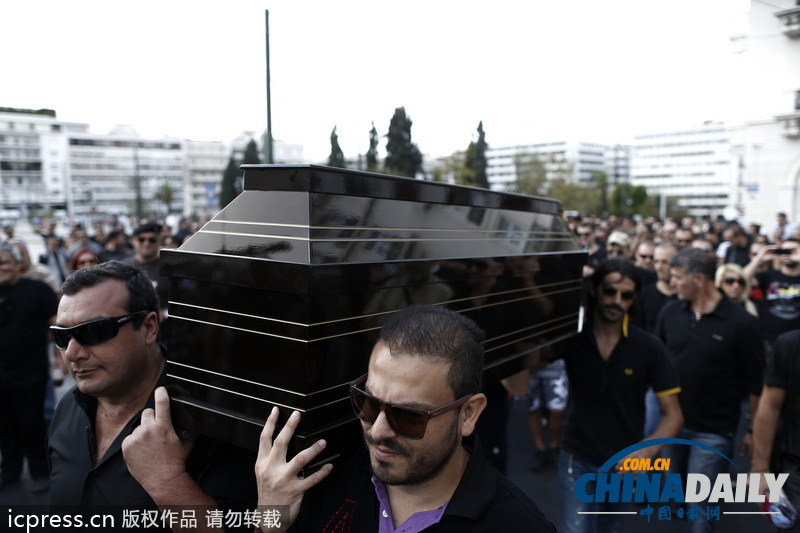 當(dāng)?shù)貢r(shí)間2013年9月23日,希臘雅典,市政警察進(jìn)行游行抗議。當(dāng)天,約500名抗議者,大多身著黑衣,跟在象征市政警察已然死亡的棺材和花環(huán)后游行,抗議政府裁員計(jì)劃。