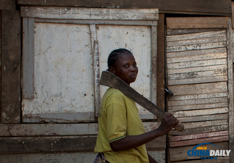 當?shù)貢r間2013年12月31日,中非班吉,一名扛著彎刀的基督教民兵組織女成員。據(jù)稱他們并非“反巴拉卡”組織的成員,而是當?shù)丶儗僮孕l(wèi)的基督教社區(qū)居民。據(jù)悉,自2013年3月中非反政府武裝聯(lián)盟“塞雷卡”奪取了首都班吉的控制權以后,支持他們的穆斯林社團與以基督徒為主的民兵組織“反巴拉卡”之間沖突不斷,目前已造成數(shù)百人死亡,幾十萬人流離失所。(圖片來源:東方IC)