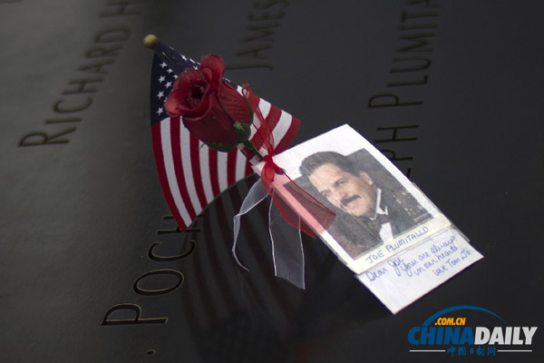 2013年9月10日,有民眾在美國9·11國家紀念館北水池留下一朵玫瑰花和一個便條,紀念在9·11恐怖襲擊中喪生的親友。