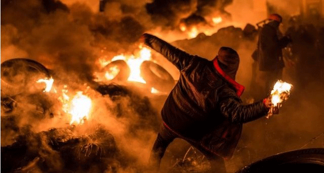 24日晚,在基輔市中心,漆黑的夜空被一個又一個火球點(diǎn)亮。那里,反對派示威者與警方的暴力沖突再次開啟,示威者扔出石塊、爆竹和汽油彈,警察則用催淚瓦斯進(jìn)行回?fù)?。示威者還把用來堆砌路障的橡膠輪胎點(diǎn)燃,以阻止警方靠近。