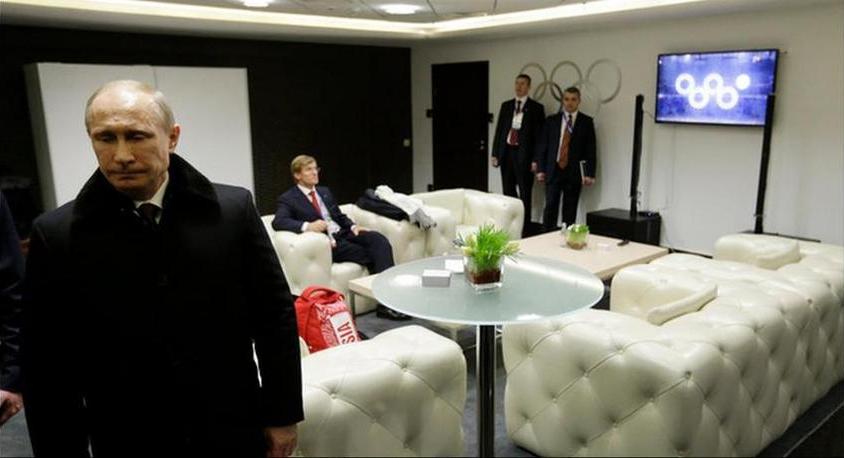 普京當(dāng)時正準(zhǔn)備出場宣布冬奧會正式開幕,室內(nèi)的電視畫面則在直播開幕式。在五環(huán)變四環(huán)的一刻,普京正好轉(zhuǎn)過頭。(圖片來源:美國媒體)