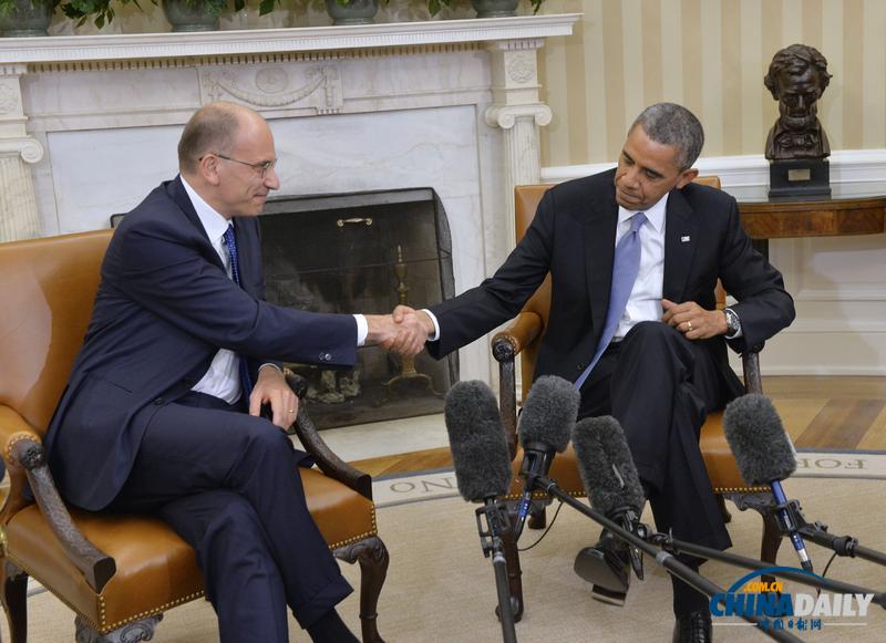 當(dāng)?shù)貢r間2013年10月17日,美國華盛頓白宮橢圓形辦公室,美國總統(tǒng)奧巴馬(右)會見到訪的意大利總理萊塔握手,雙方就經(jīng)濟和全球安全等議題展開討論。(資料圖片)