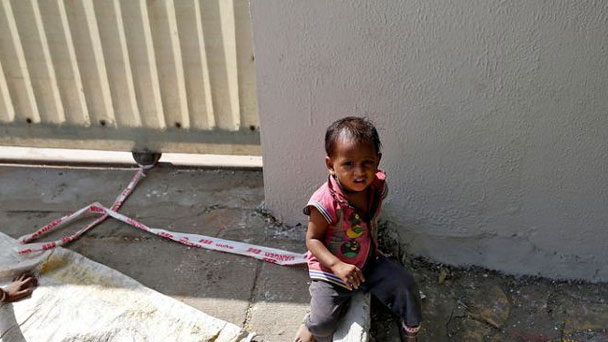 在印度西部的一處建筑工地外,頂著40攝氏度的高溫,右腳被膠帶綁住,膠帶的另一端固定著一塊大石頭,年僅15個(gè)月的印度女童希瓦尼就這樣赤著腳,無人看管,一待一天,長(zhǎng)達(dá)9小時(shí)。