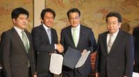 日本民主黨黨首岡田克也與維新黨黨首松野賴久26日舉行會(huì)談,簽署了確認(rèn)“爭取3月份組成新黨”的文件,就兩黨合并正式達(dá)成協(xié)議。
